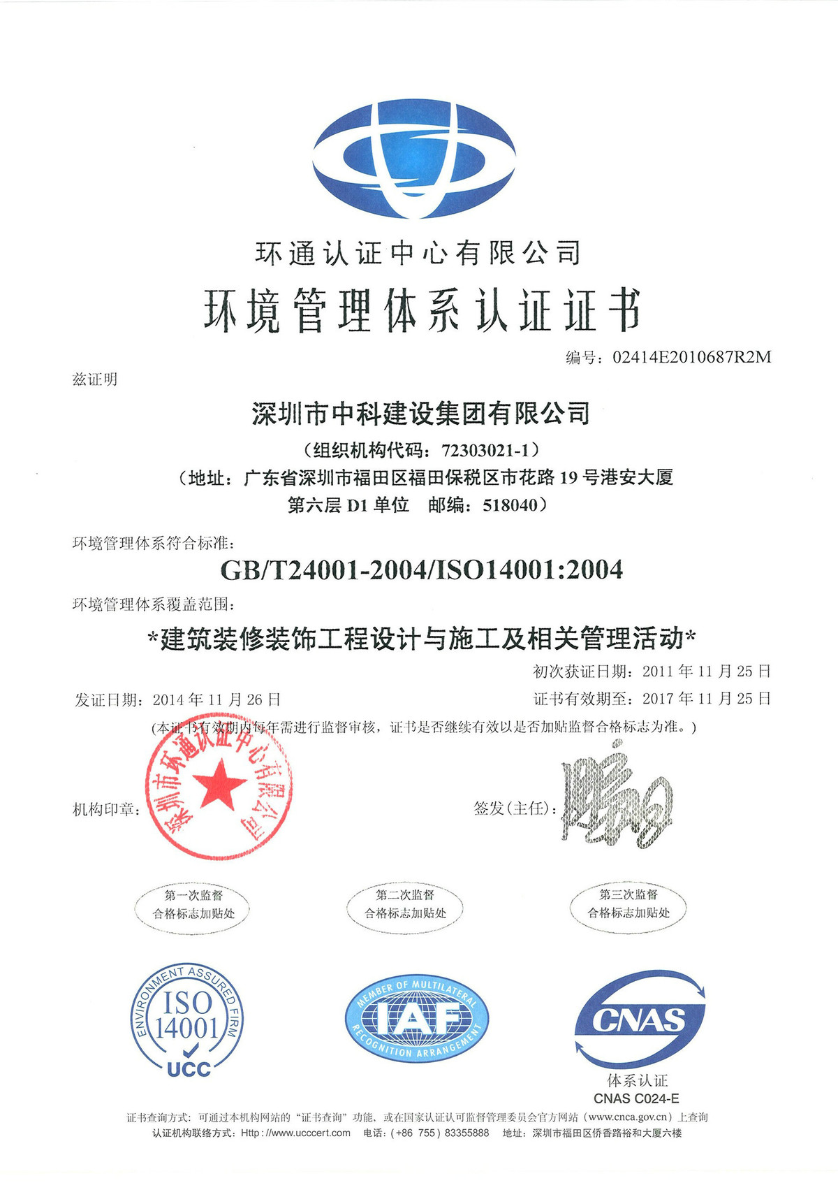 環(huán)境管理體系認證證書