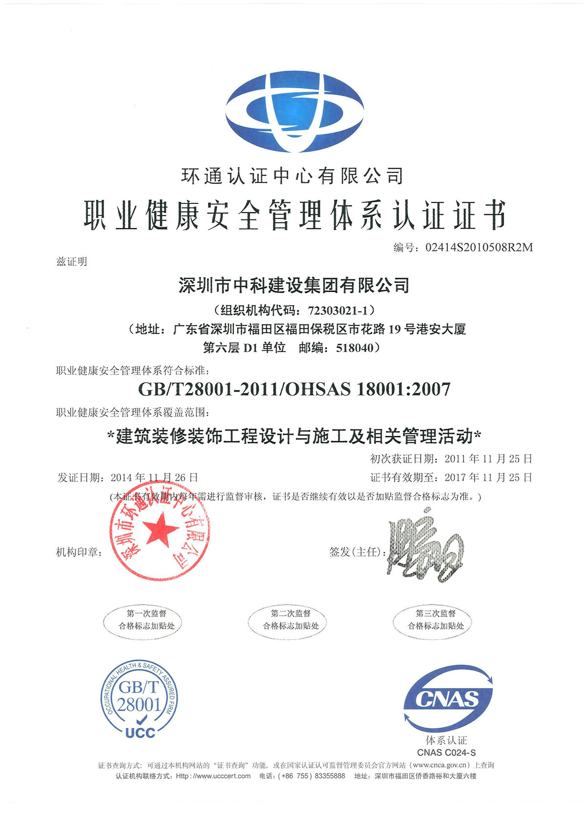 職業(yè)健康安全管理體系認證證書